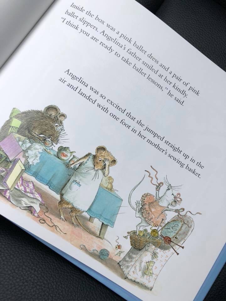 Angelina Ballerina è una Topolina che sogna, fortissimamente sogna, di diventare una ballerina; siccome sognare a occhi chiusi non le basta, Angelina sogna anche ad occhi aperti e combina un sacco di pasticci, come ad esempio rovesciare brocca del latte e focacce nel tentativo di eseguire un arabesque. La lettura procede piacevolmente fra una risata e l’altra, finché arriva al punto di svolta: la mamma non sa più come fare con questa figlia con la testa che volteggia fra le nuvole e chiede aiuto al papà. Dopo averci rimuginato un po’ i genitori di Angelina escono e la mattina dopo la topina a colazione trova un enorme pacco regalo ad attenderla (che vale a mamma e papà il mio personalissimo premio “i figli si ascoltano non si puniscono”, ndr) al cui interno c’è uno splendido tutù e l’annuncio della decisione di iscriverla a scuola di danza. Angelina si sente la topolina più felice del mondo e da quel giorno lavora con impegno e concentrazione. Riuscirà Angelina a realizzare il suo sogno?