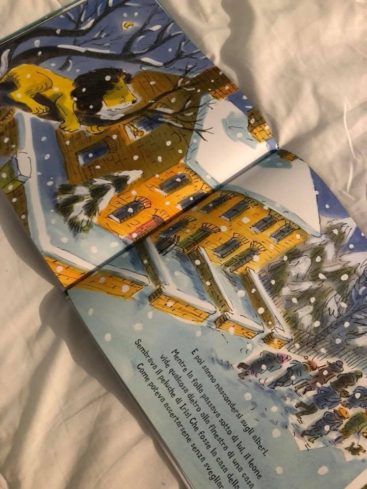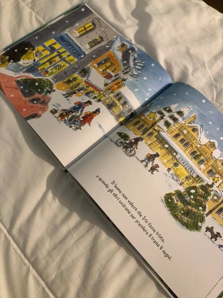 Iris deve prendere il treno con la sua famiglia per andare a festeggiare il Natale a casa della zia, ma… il leone non può venire! Non si può portare un leone sul treno e gli abitanti del paese della zia si spaventerebbero. Iris va via molto triste, ma il leone non vuole che Iris sia triste e allora la segue e sale sul treno, ma si addormenta, e quando si sveglia Iris non è più sul treno. Non voglio raccontarvi come andrà a finire ma posso dirvi che anche se i leoni passano tanto tempo a dormire, sanno essere veramente svegli quando serve.