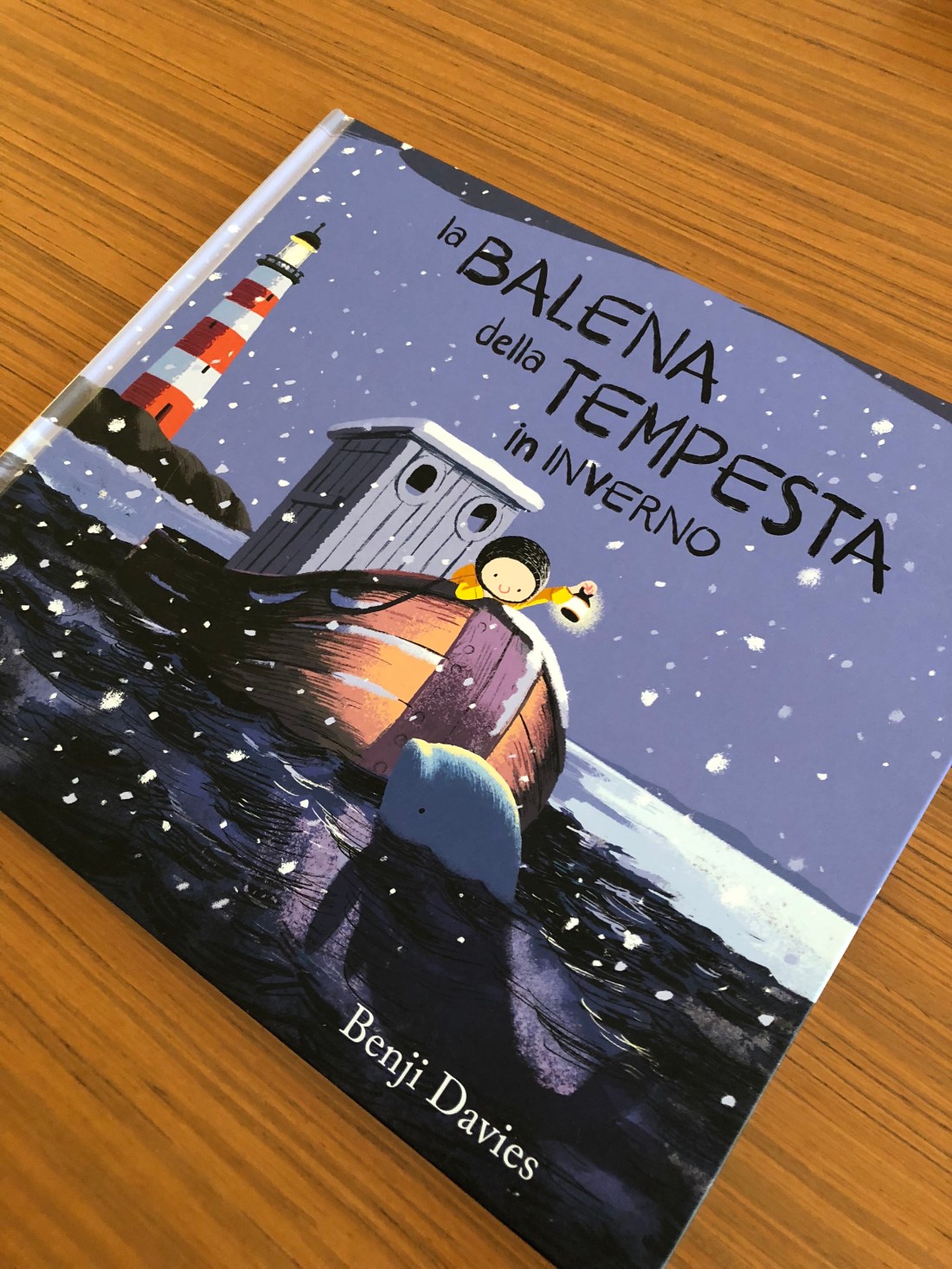 Nico si avvolge stretto nell’impermeabile del papà, e comincia ad avere paura, quando… TUMP! un colpo sotto la barca seguito da altri colpi ancora: è la balena della tempesta! È tornata e insieme a tutto il branco spinge la barca rompendo il ghiaccio, fino a raggiungere il faro, dove il papà con altri pescatori hanno trovato rifugio, e salvando tutti.