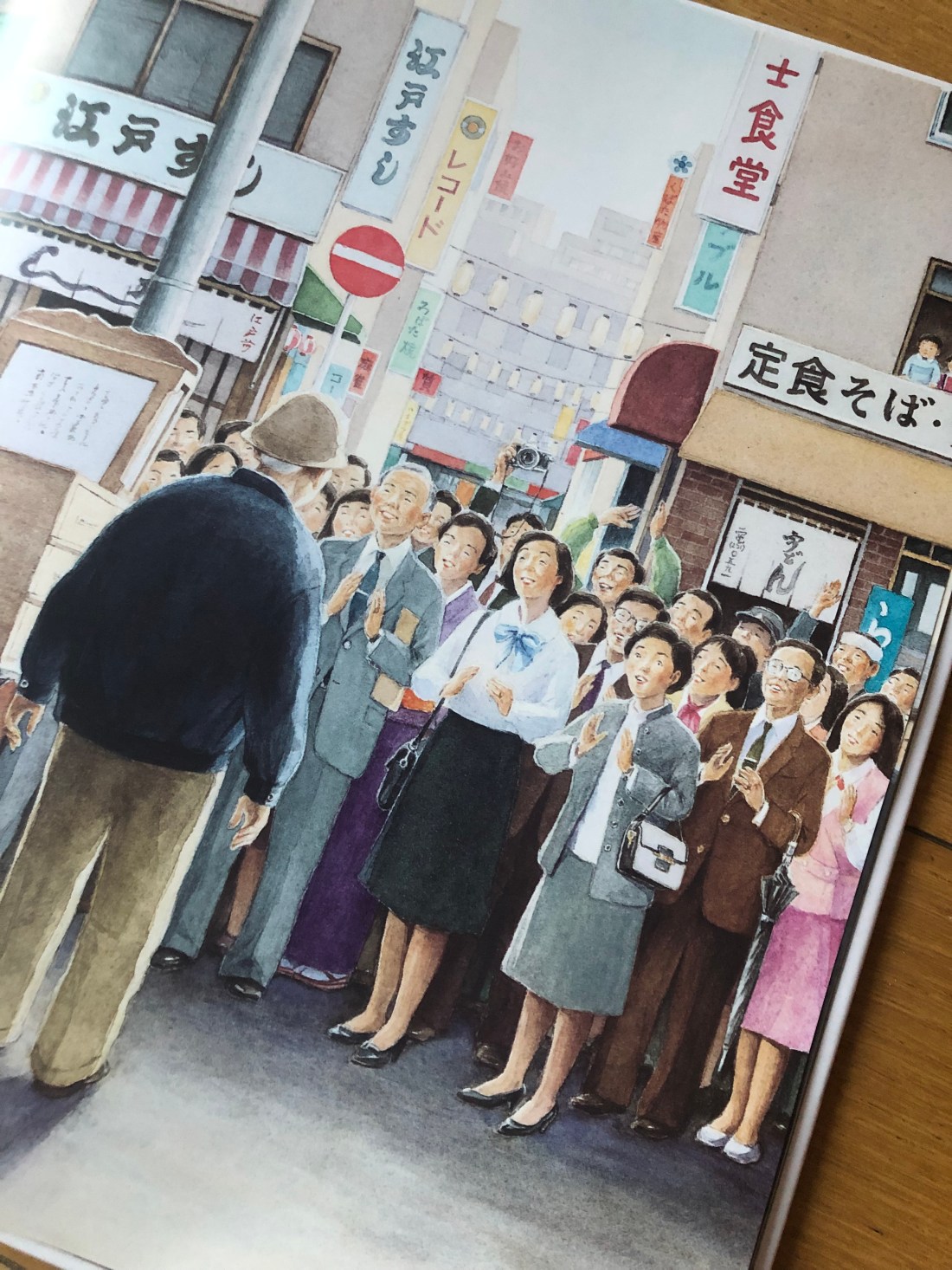 Proprio quel bambino ci riporta nel presente facendosi riconoscere: l’uomo alzò gli occhi e vide una folla, erano i bambini ormai adulti, cresciuti con le sue storie che lo salutavano e lo pregavano di raccontare ancora questo o quel racconto. Questo stacco, concentrato nell’uomo che alza lo sguardo e supportato degnamente dalle immagini, ha un impatto emotivo fortissimo, tanto che la voce, mi si rompe nel pensiero, per l’emozione. Artebambini regala un albo di una dolcezza struggente, che illustra con finezza e intensità la poesia di un’intera vita che si svela pagina per pagina intrecciando la tradizione di una delle culture, quella giapponese, più affascinanti del mondo.