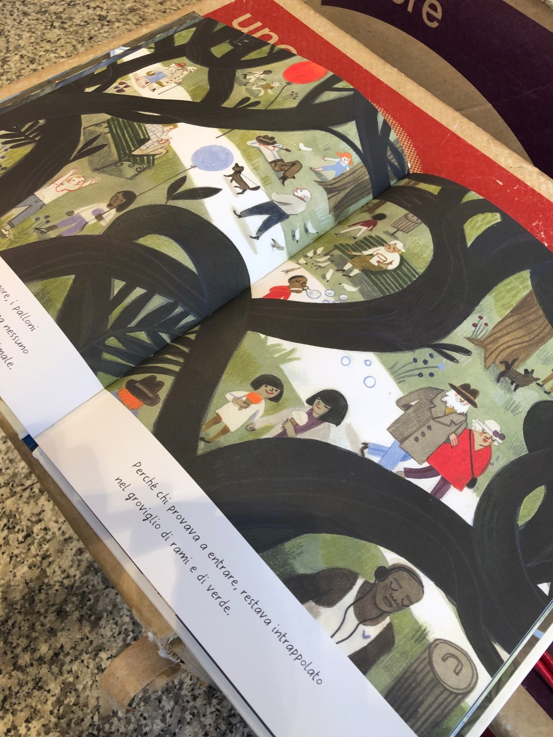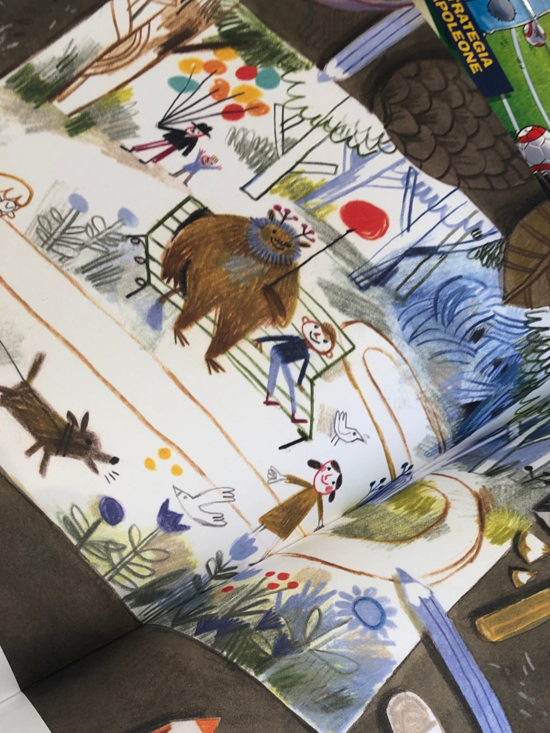 Mano per mano con lo strano animale, Arianna torna al presente, lasciando sul foglio un disegno con una bambina e uno strano animale seduti su una panchina del parco, aperti al mondo. Alle loro spalle un groviglio di rami.