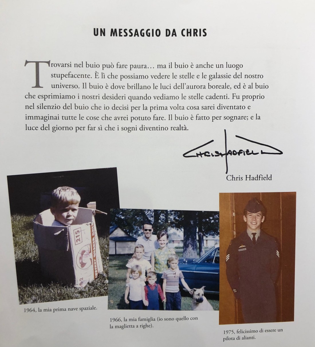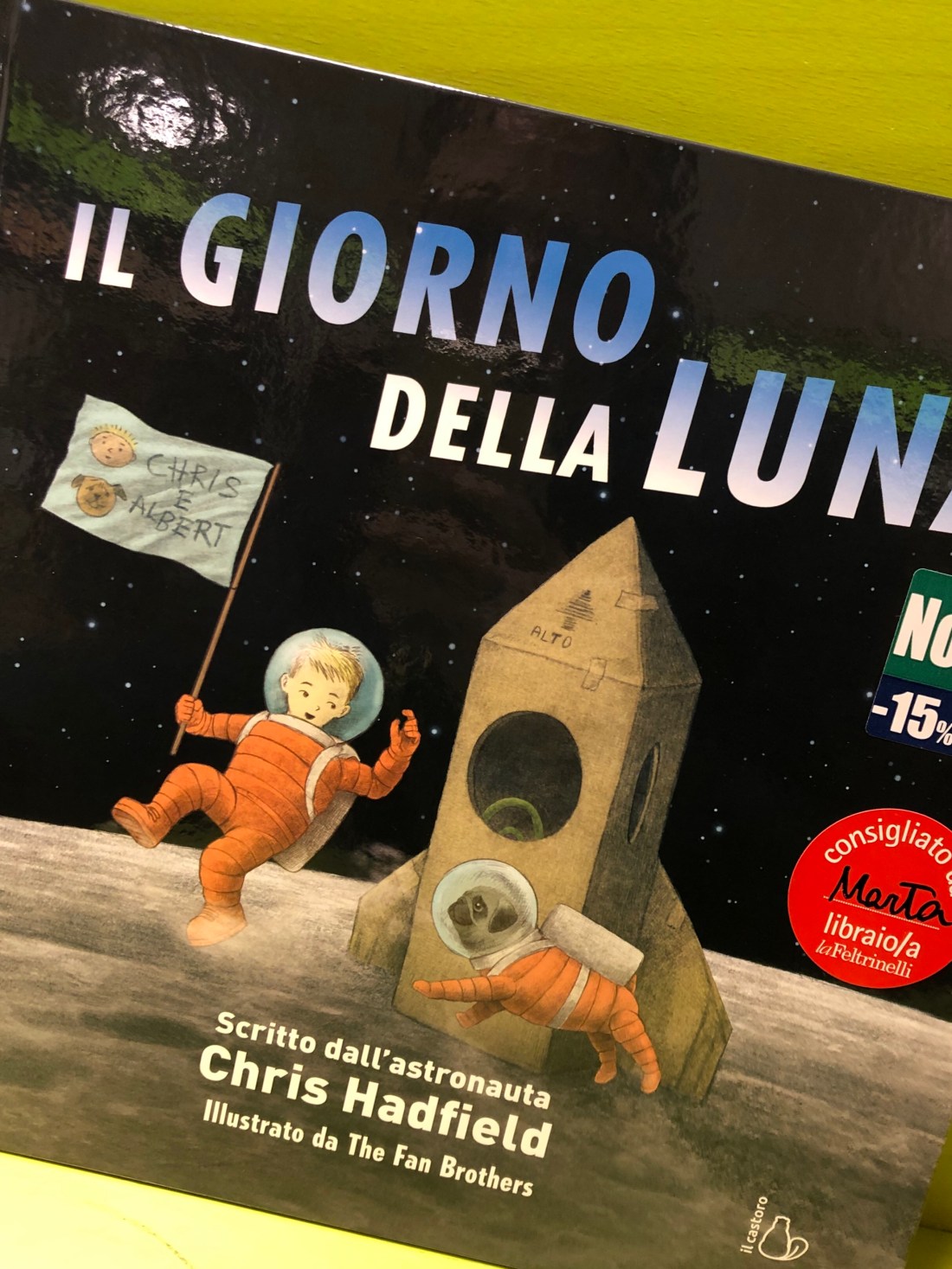 “Il giorno della luna”, infatti, è la storia autobiografica di un vero astronauta, Chris Hadfield, che la sera del primo sbarco sulla luna era un bambino fissato con lo spazio, che aveva paura del buio. Assistendo allo sbarco dalla tv del vicino, l’unica in tutta l’isola, scoprì che lassù nello spazio il buio era molto più buio e soprattutto che desiderava esplorarlo. Quella notte Chris decise che sarebbe diventato un astronauta e che avrebbe sconfitto la sua paura del buio, così non appena tornò a casa spense tutte le luci e vide che il buio non era cambiato, ma era cambiato lui.