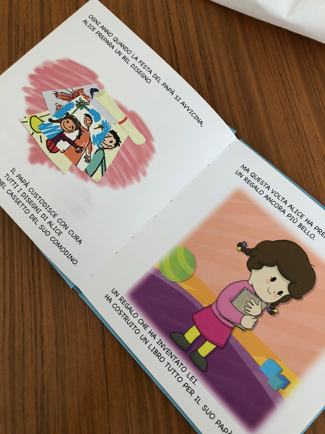 Questo piccolo volume è la mia scelta di quest’anno per la festa del papà; parla di Alice che vuole così tanto bene al suo papà da creare per lui qualcosa con le sue mani e soprattutto con tutto il suo amore.