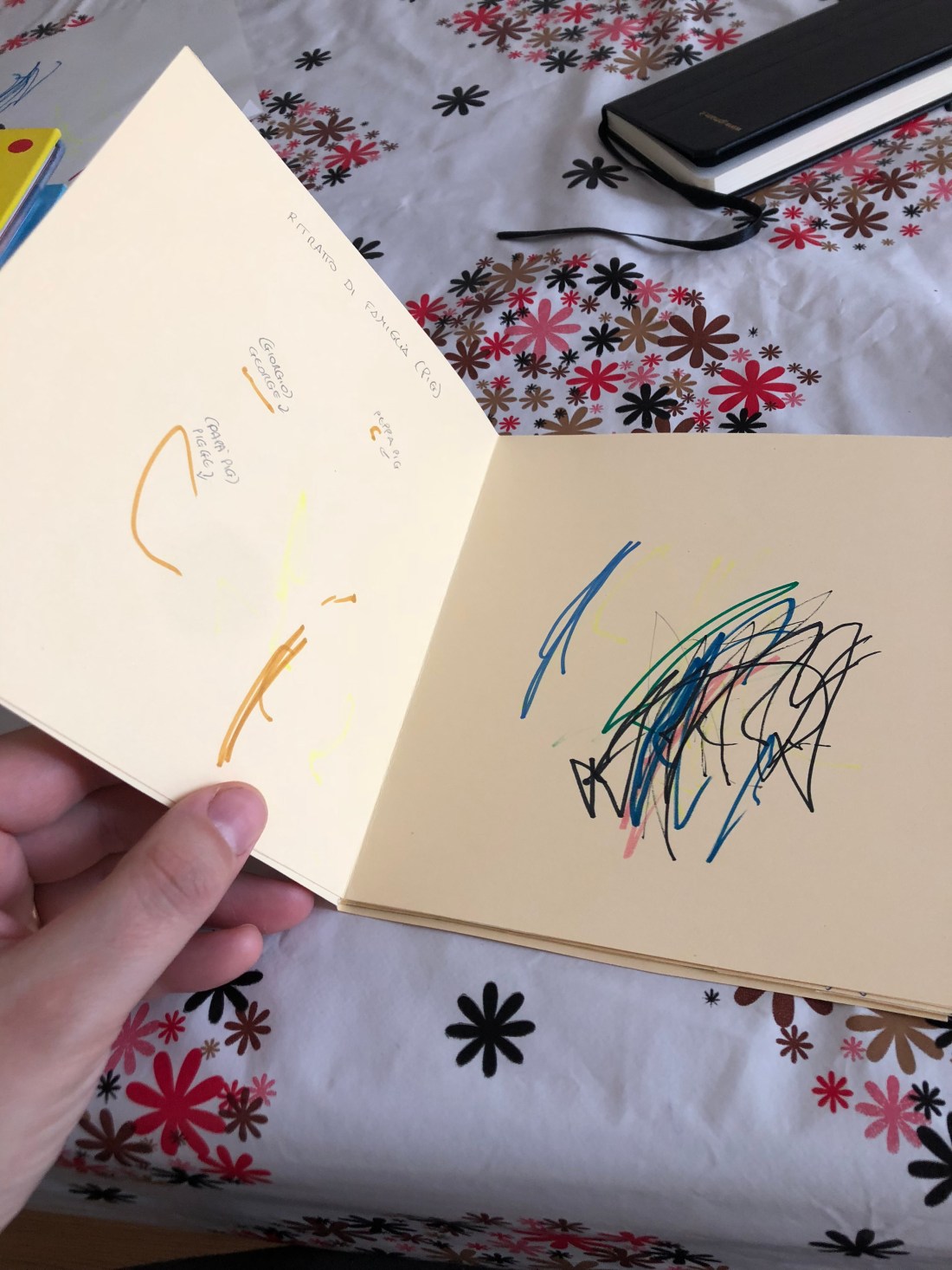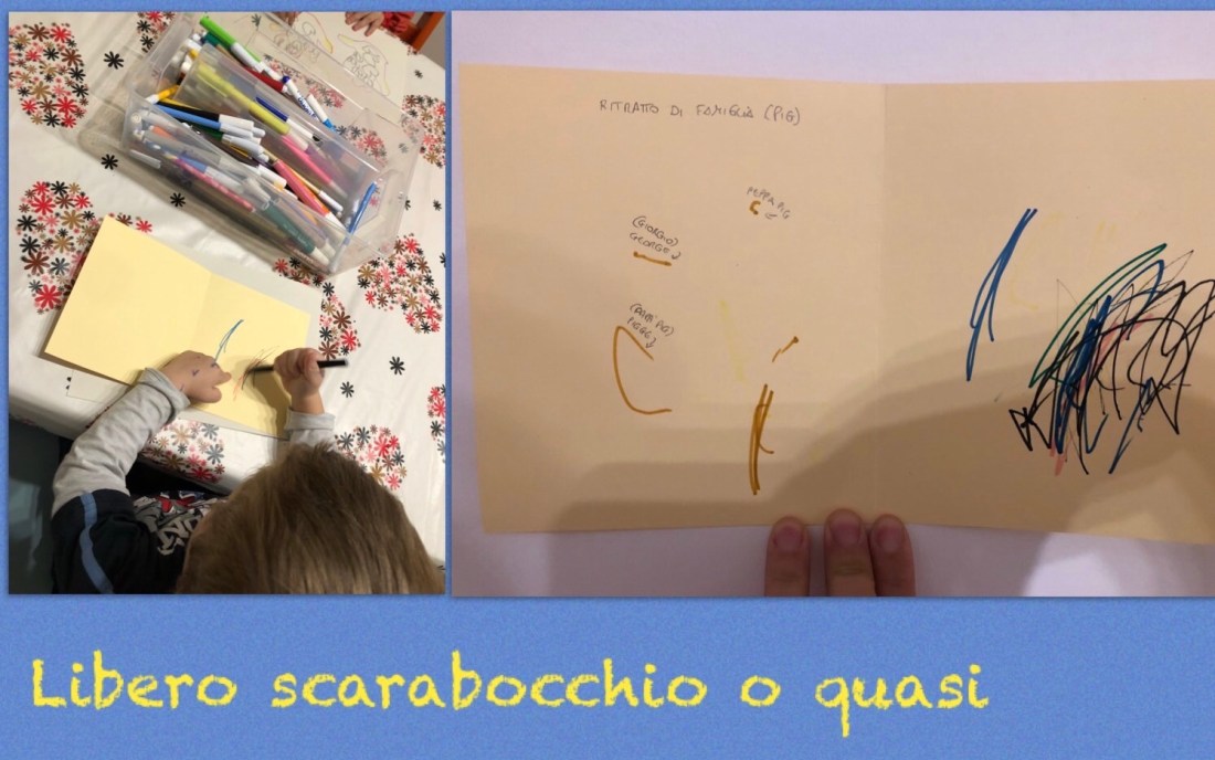 Ciascuno ha fatto un disegno. Il duenne si è cimentato in libero scarabocchio, la quattrenne come Alice ha disegnato dei momenti insieme.