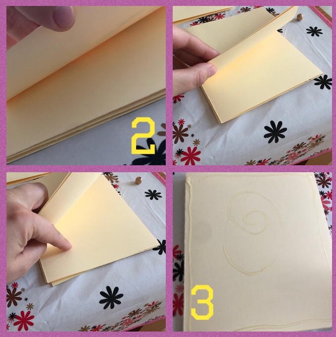 A questo punto, incolliamo il retro di “pagina 2” col retro di “pagina 3”, poi pagina 4 con pagina 5 e così via, stando bene attenti a mettere la colla lungo i bordi. (foto 2 e 3).