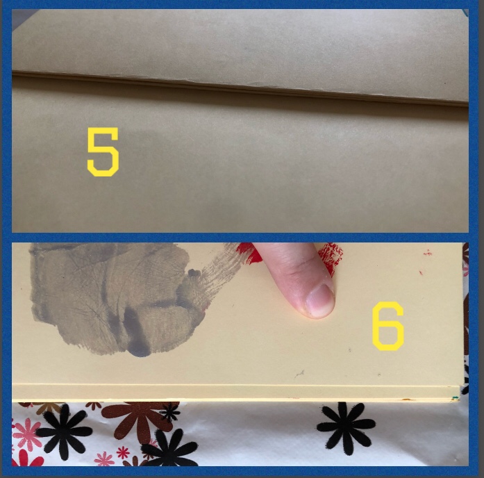 I cartoncini sovrapposti fanno uno spessore di 3/4 millimetri (foto 5); avremmo dovuto in fase iniziale tagliare una ministriscia di 2 mm sul lato corto di un A4 per assorbirlo, ma diventa troppo tecnico per farlo con bimbi in età prescolare. Così allineiamo la copertina frontale e scarichiamo il mezzo millimetro sul retro (foto 6)