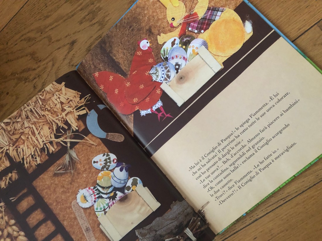 La faccenda crea più di qualche perplessità alla contadina, soprattutto perché le persone non vogliono comprare uova decorate, e lei non riesce a venderle. Un giorno Fiammetta, spintasi un po’ troppo in là nella ricerca di nuovi tesori, conosce il Coniglio di Pasqua disperato per aver rotto tutte le uova. Per fortuna Fiammetta salverà lui e anche la Pasqua 😉.